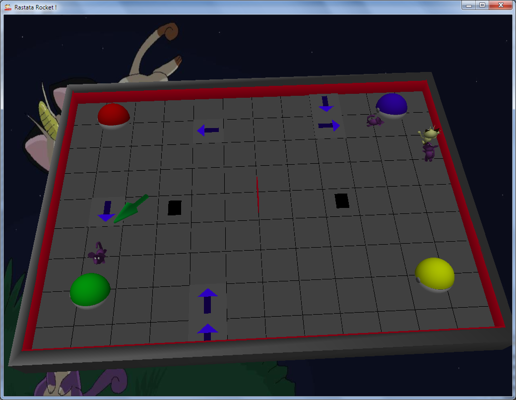 | Le JeuRastatarocketOrigineRastatarocket prend pour origine un jeu — sorti en 1999 sur la console dreamcast de SEGA — nommé ChuChu Rocket. PrincipeCe jeu se deroule sur un niveau composé de cases qui peuvent être occupées par certains elements, comme notamment des zones de « pop », des bases, des murs ou des trous. Le principe du jeu est d'emmener les souris de la zone de « pop » à sa base. Pour cela il faut se servir de flèches (chaque joueur peut avoir un maximum de trois fleches posées simultanément) que l'on appose dans les cases : celles-ci indiquent aux souris la direction à suivre afin d'arriver jusqu'à la prochaine flèche, mur ou base. Le but du jeu est donc d'amasser plus de souris que ses adversaires — au nombre de trois maximum — avant la fin du temps imparti afin de remporter la partie. |